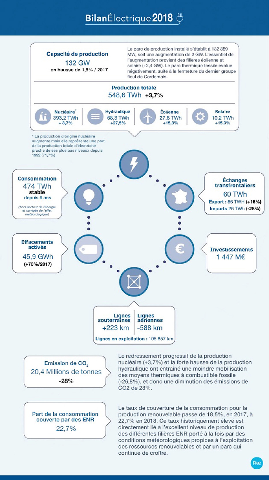 En parallèle, la consommation du pays reste stable depuis six ans. Le taux de couverture par la production renouvelable passe de 18,5 % en 2017 à 22,7 % en 2018. Un taux historiquement élevé.