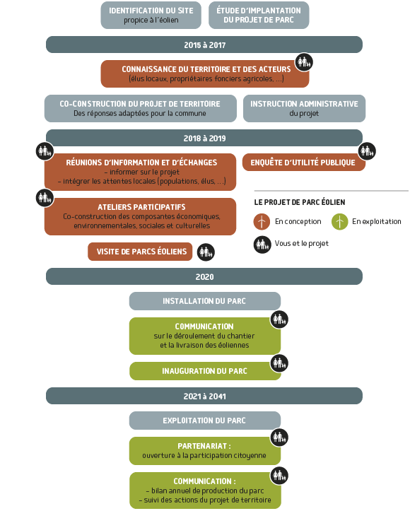 Nous vous présentons dans le schéma ci dessous, la démarche de concertation qui accompagne nos projets éoliens.
