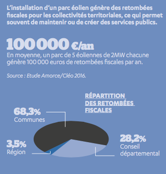 – D’un point de vue financier, un parc éolien, comme toute entreprise, apporte des recettes fiscales à la commune ; plus encore il peut également apporter des ressources plus conséquentes liées à l’utilisation et l’entretien des voies communales (pour accéder au site), à la location des terres si elles sont communales, ou à d’autres prestations associées au projet. Voir infographie en pied de page (source FEE livret « un vent de transition », février 2018)
